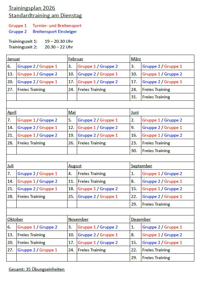 Dienstags von 19.00 Uhr bis 22.00 Uhr Turnier- und Breitensportpaare und Standard-Techniktraining für Hobbypaare im zeitlichen Wechsel laut Trainingsplan.